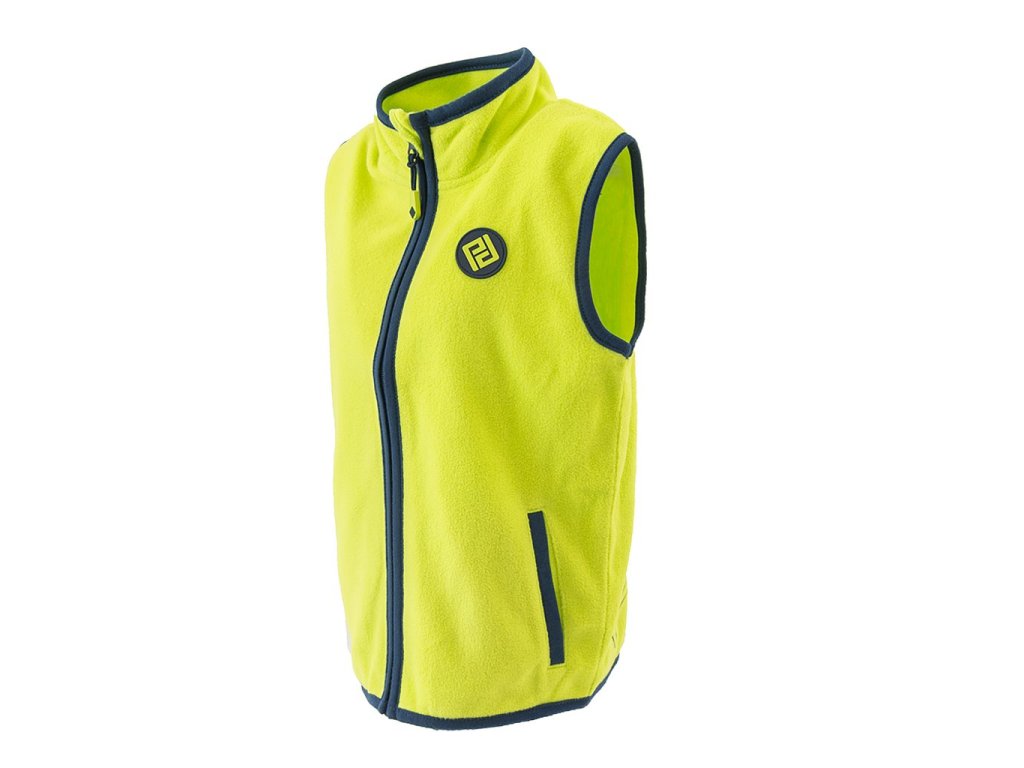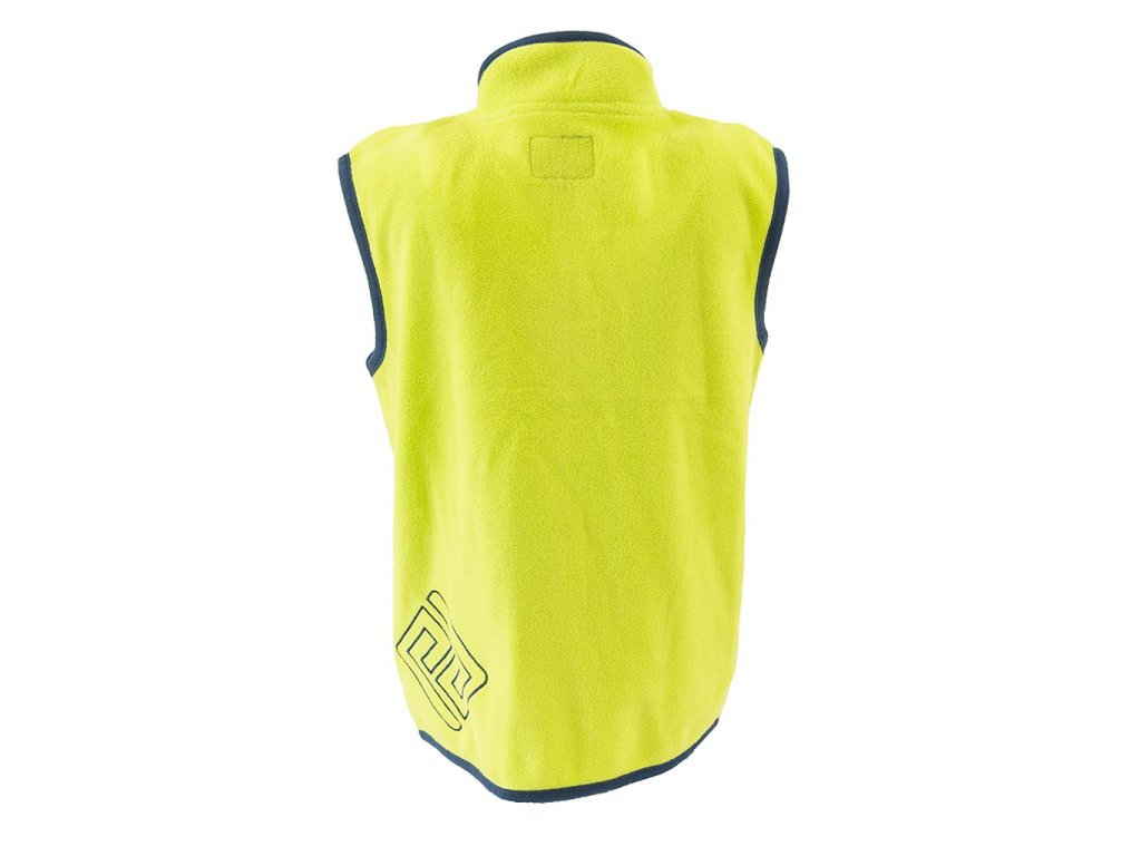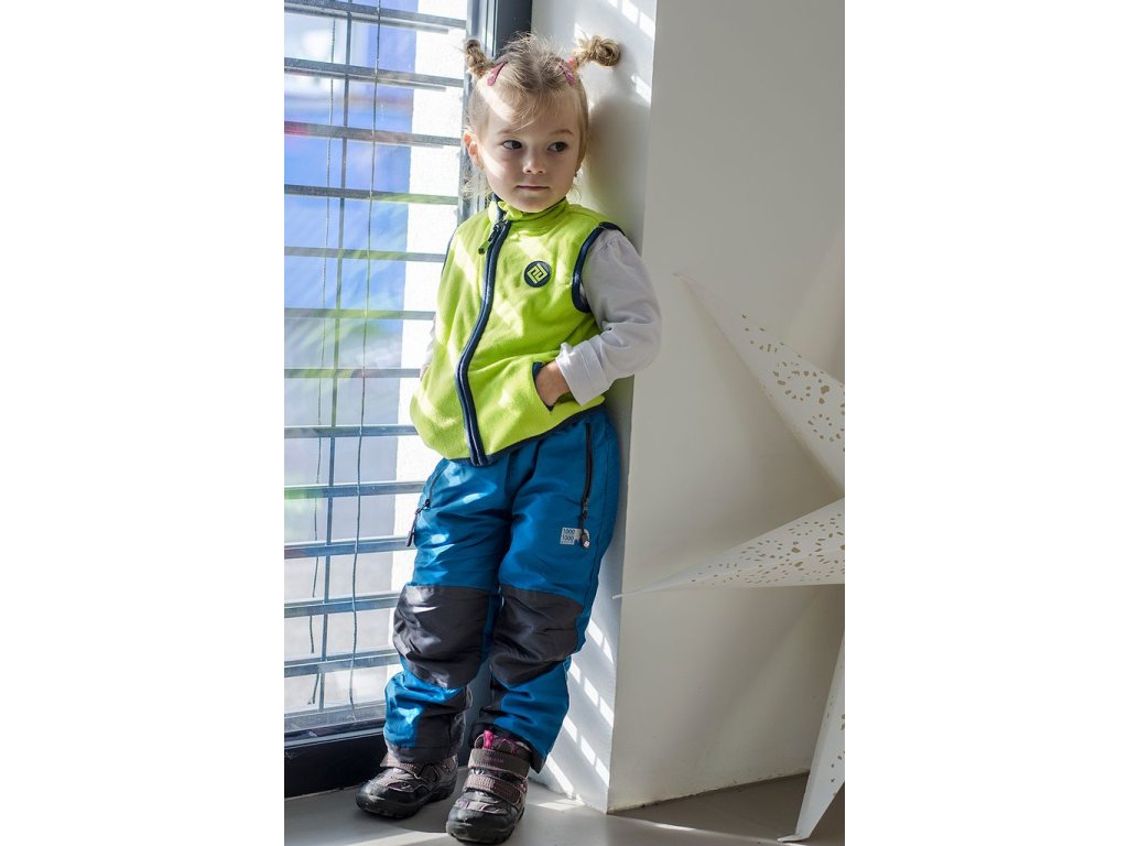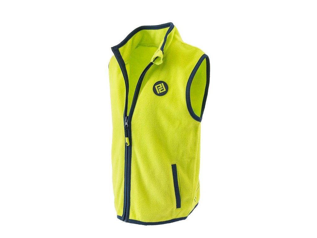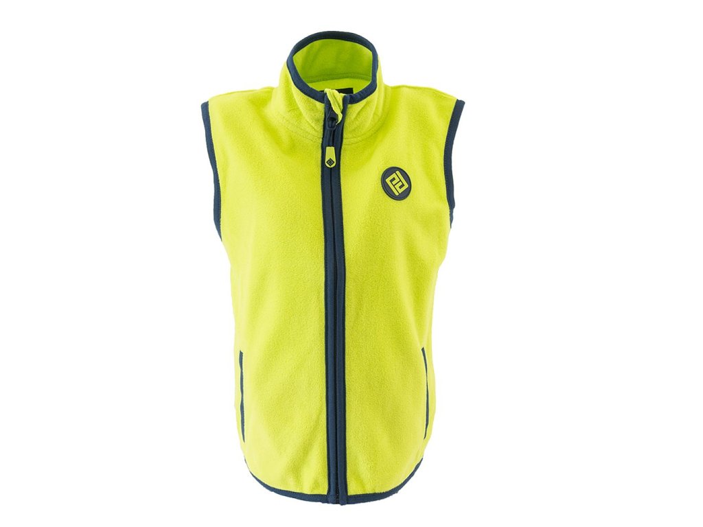 Dětská propínací fleezová vesta. Stojací límec, dvě kapsy, barevné kontrastní lemy.