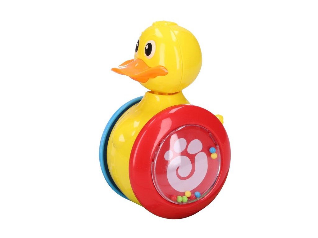Barevná kachna na kolečkách zaujme pozornost dětí především díky houpavému pohybu a chrastícím zvukům malých kuliček.