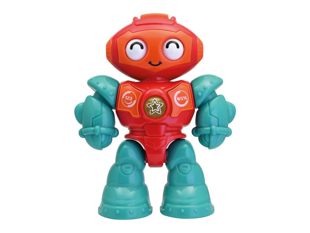 Volná kolečka na zadní straně nohou, lze ho posadit a jezdit. Automatické vypnutí při nečinnosti. 2 x AA, součástí.