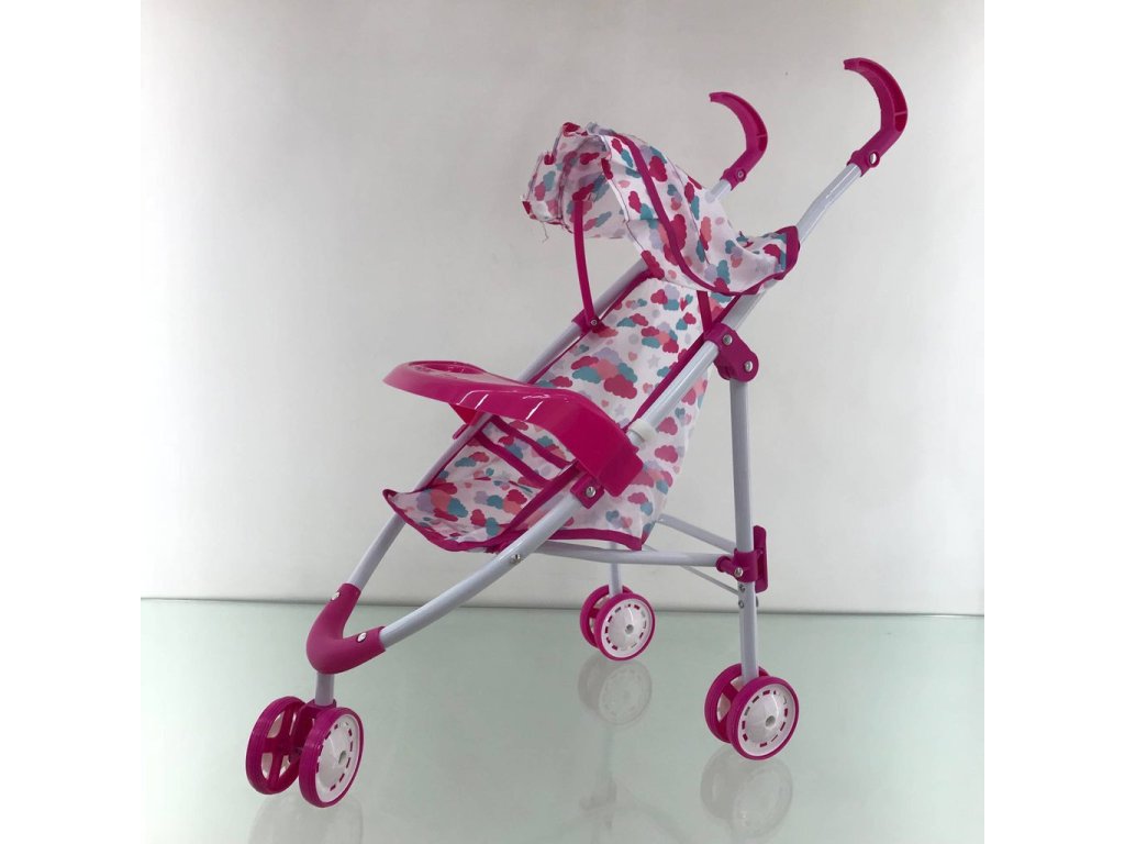 Sportovní tříkolový kočárek pro panenky ve veselých barvách. Kočárek je jednoduše složitelný, má stahovací stříšku.