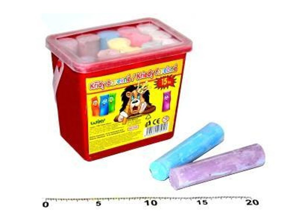 15 kusů barevných chodníkových kříd v pevném plastovém boxu s víčkem a držadlem pro přenášení.