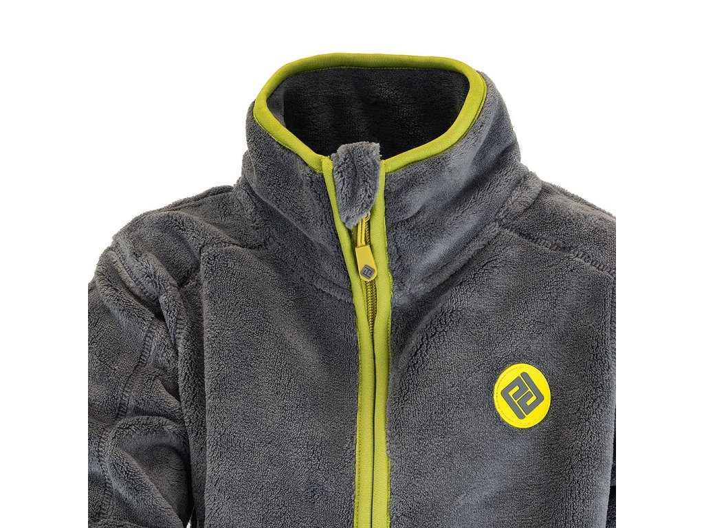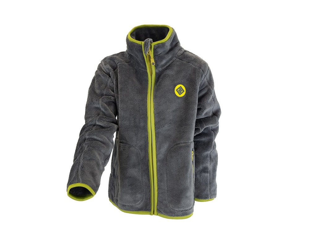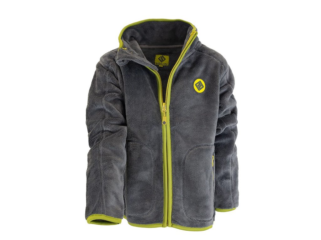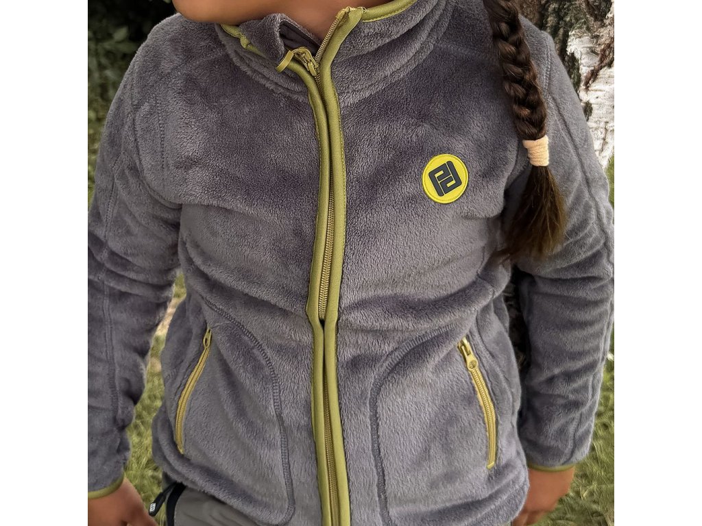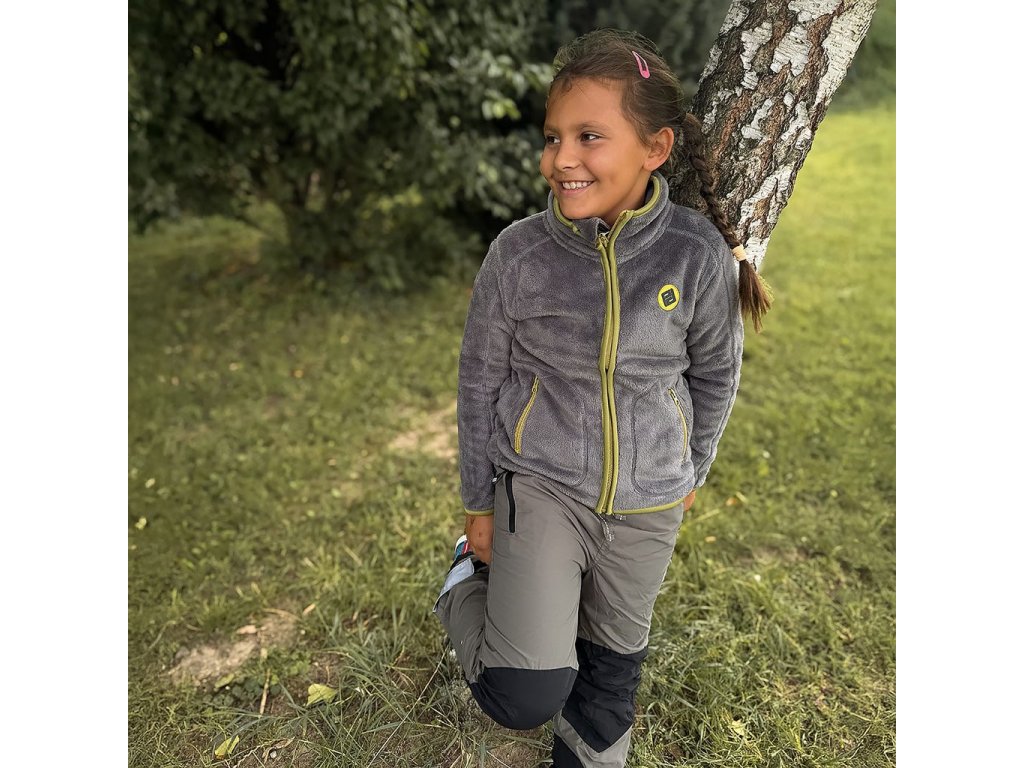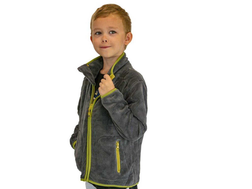 Dětská propínací chlupatá mikina v šedé barvě. Stojací límec, dvě kapsy, barevné kontrastní lemy.