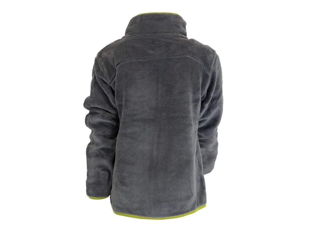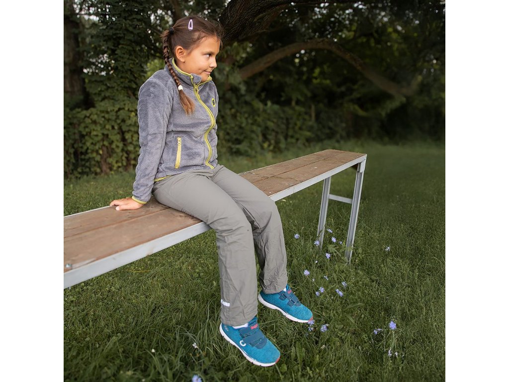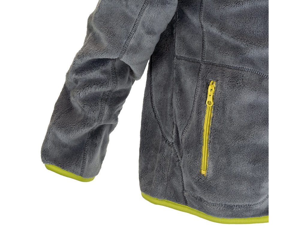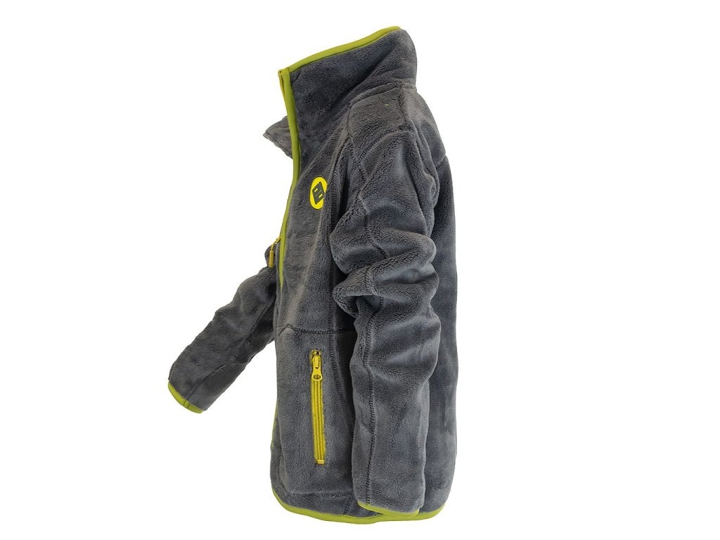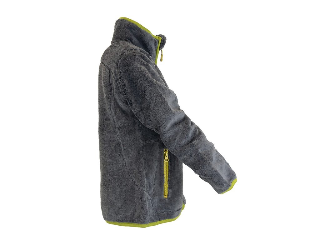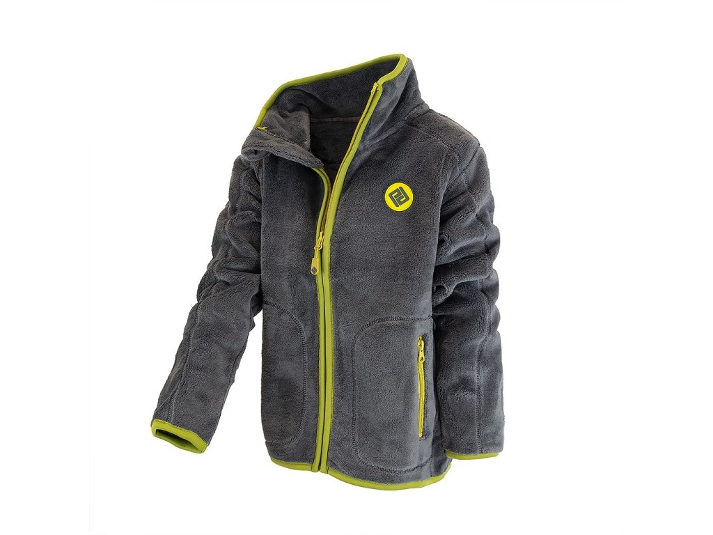 Dětská propínací chlupatá mikina v šedé barvě. Stojací límec, dvě kapsy, barevné kontrastní lemy.