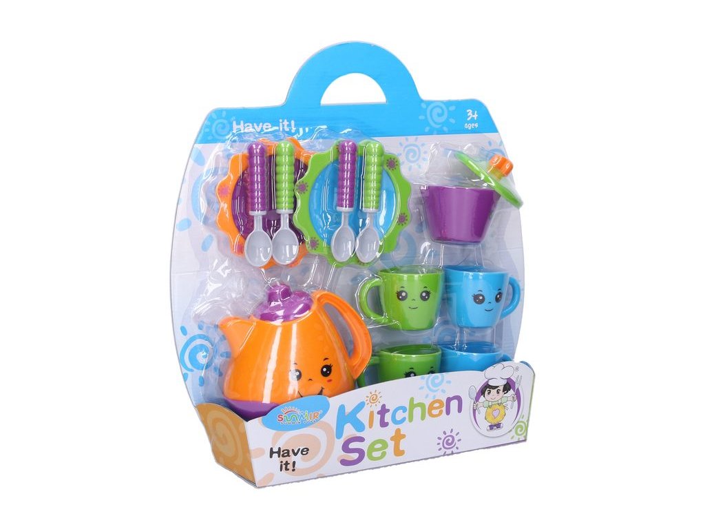 Barevná plastová sada nádobí se na tebe bude přímo usmívat! Roztomilý vzhled nádobíčka s obličejem nesmí chybět ve tvé kuchyni! Udělej si s maminkou výborný šálek čaje nebo kakaa a k tomu si dejte třeba něco na mls!