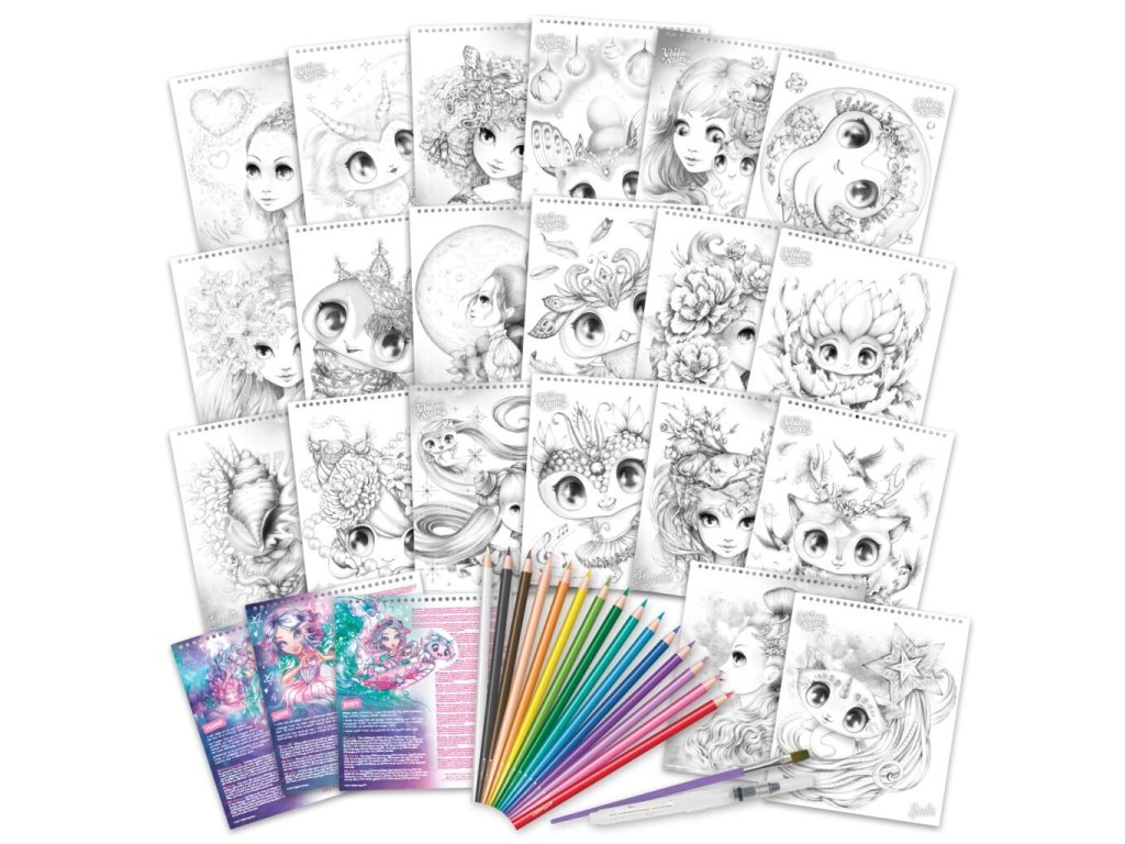 Obsah balení - 20 ručně kreslených ilustrací, 15 vodových fixů, doplnitelný štětec pro vodové barvy, štětec, příběh, návod.