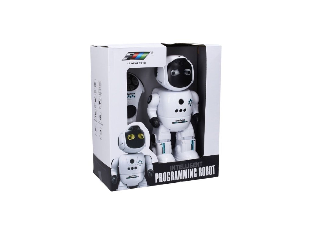 Světelné a zvukové efekty. Funkce - podsvícený obličej (mění výraz), pohyb hlavy, ovládání pohybem ruky, ovládání dotykem, programování, demo režim, zvuky, hudba, nastavení hlasitosti. 3.7V 500mAh bateriový pak do robota součástí, 2xAAA do ovladače nejsou součástí. USB kabel součástí. Tlačítko ON/OFF na hrudi robota.