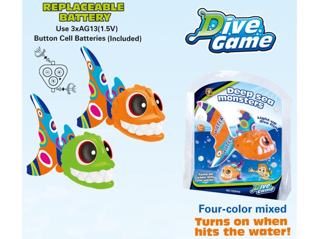 Nová vodní zábava začíná! Potop se a ulov pyraňu. Neboj! Tato nekouše. Zato má světelné efekty, které se spustí při kontaktu s vodou. Postará se tak o zábavné potápění.