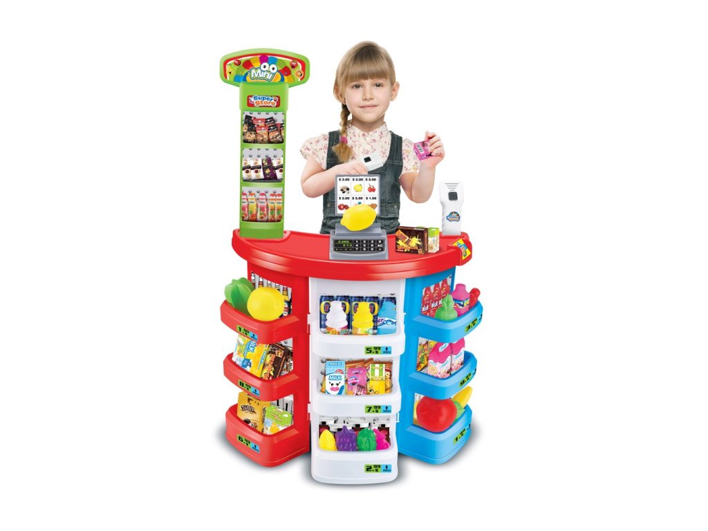 A jde se nakupovat do supermarketu! Celá rodina čeká, aby si u tebe nakoupili a prohodili několik slov. Aby ne, kde jinde by našli za pultem někoho tak milého a šikovného? Nezapomeň zase doplnit zboží! Čtečka kódů vydává zvukové a světelné efekty.