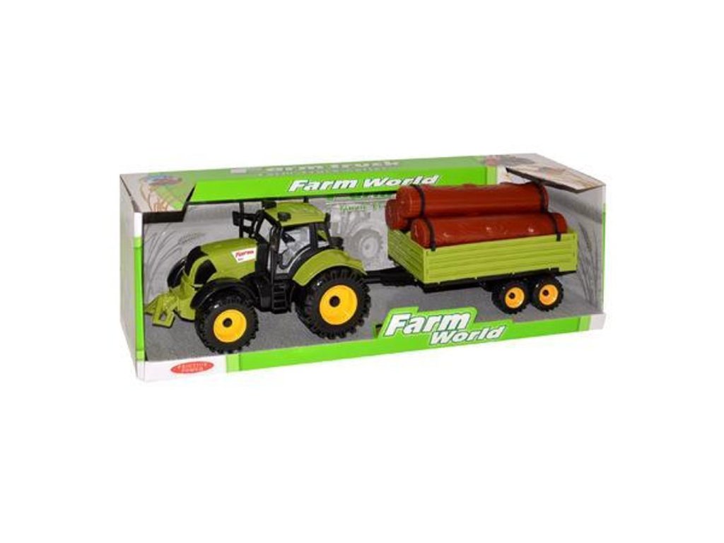 Pěkný detailní model farmářského traktoru s přívěsem a nákladem. Nezbytný doplněk každého malého farmáře, zemědělce či lesníka. Traktor to je zemědělský stroj, který zastane na poli hodně práce a děti si při hře s ním užijí spoustu zábavy.