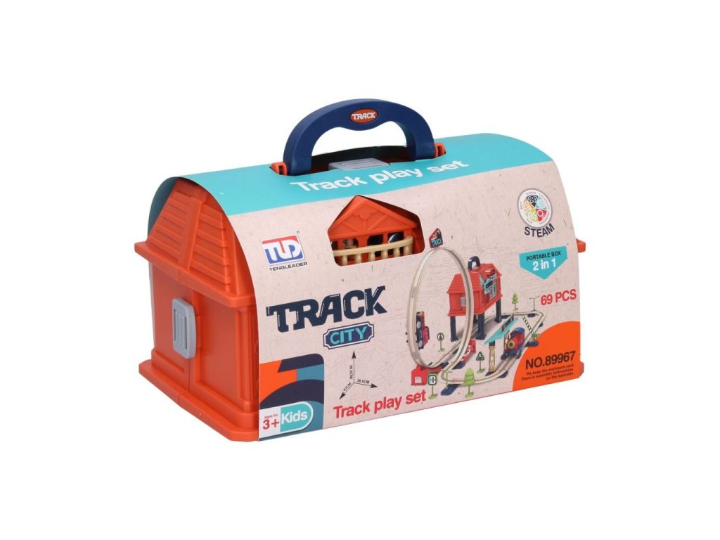 Praktický kufřík obsahující 69 dílků vlakové dráhy pro snadné přenášení a zábavu.