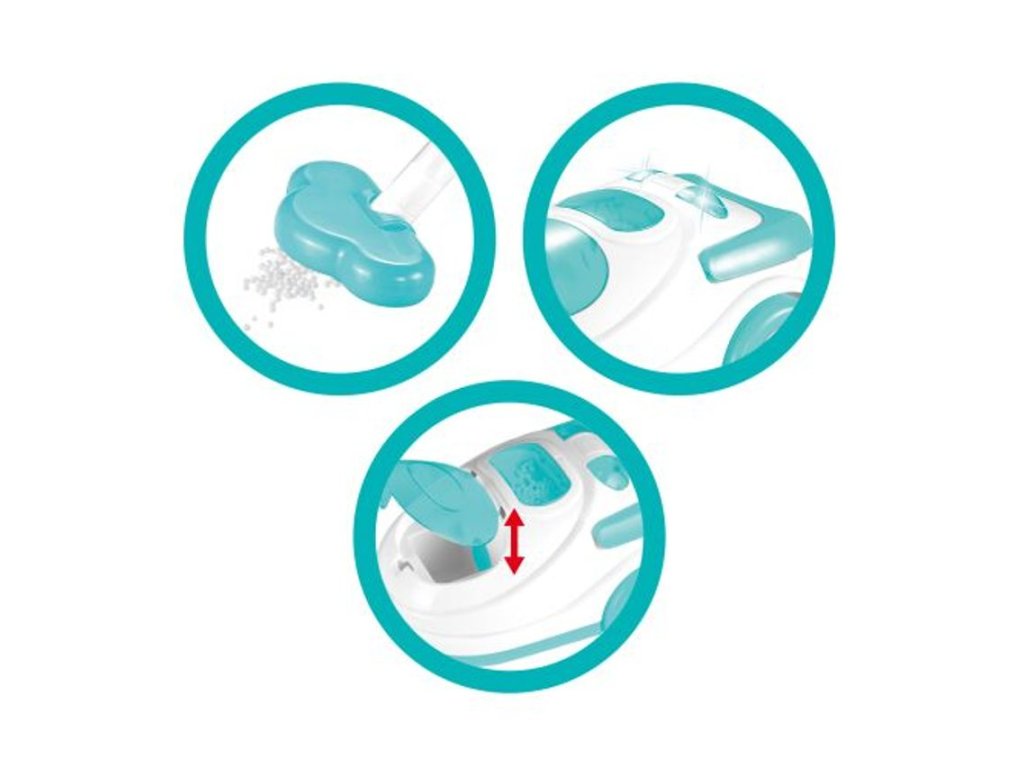 Vydává světelné a zvukové efekty. Balení obsahuje plastové kuličky k vysávání. Vysáté kuličky se ukládají v zásobníku v přední části vysavače, který je možné otevřít.